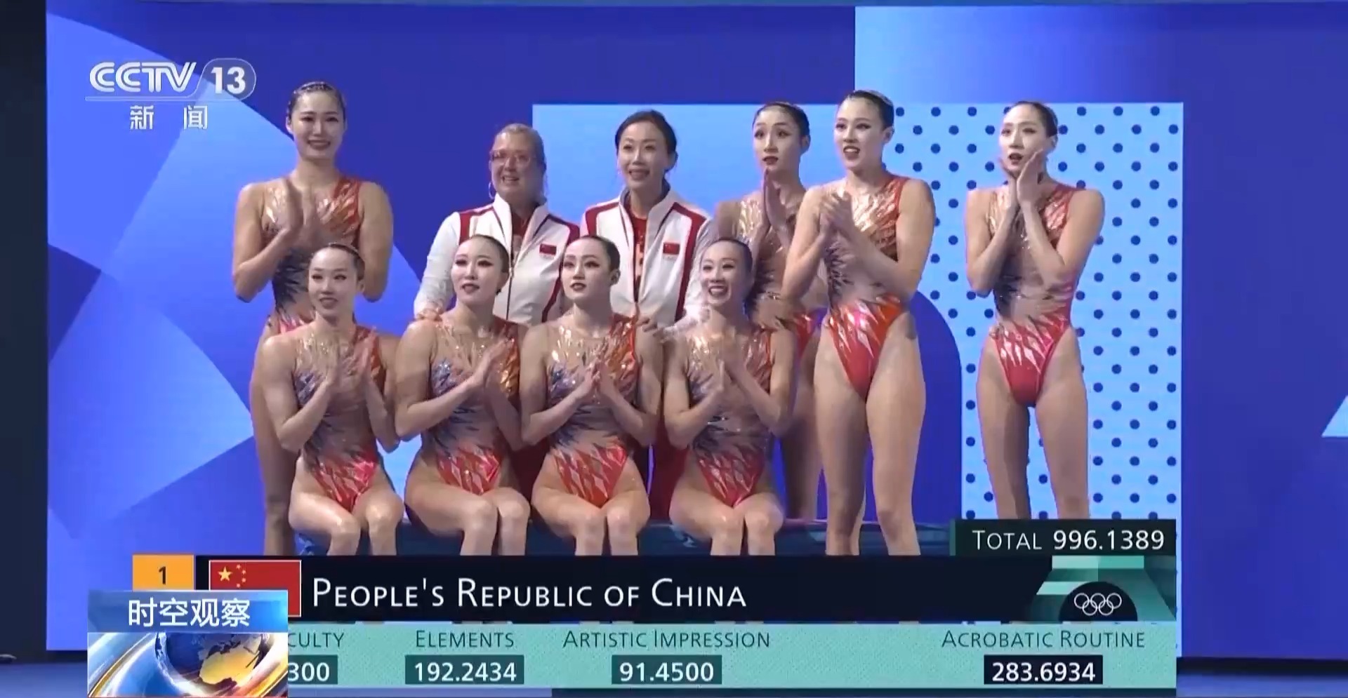 996.1389分!中国花游姑娘们以三场比赛稳居第一的优异表现,赢得了中国花游在奥运会上夺得的首枚金牌。