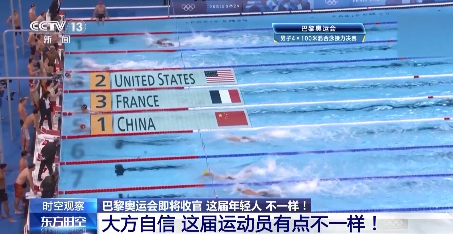 巴黎奥运会游泳赛场最后一个比赛日,中国队放了个大招。男子4X100米混合泳接力决赛上,中国队力压该项目40年“霸主”美国队,以3分27秒46的成绩夺冠。